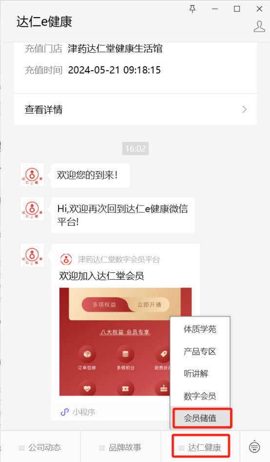(关注“达仁e健康”微信公众号,通过手机号登录“达仁健康-会员储值”),